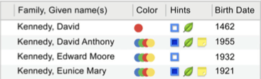 Once found only on tree views, those little green Ancestry leaves and FamilySearch hints now appear in the people index too. No more scrolling through branches to find all the latest hints. And you can check for hints for a particular family name in the Index or in a saved list.