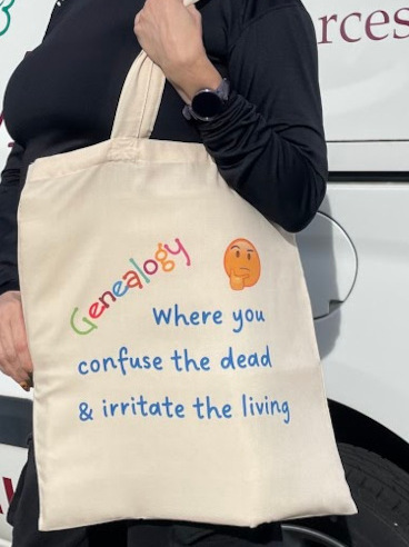 A natural coloured cloth tote bag with a fun genealogy theme on one side. 15" (38cm) x 16" (40cm) size with long handles.